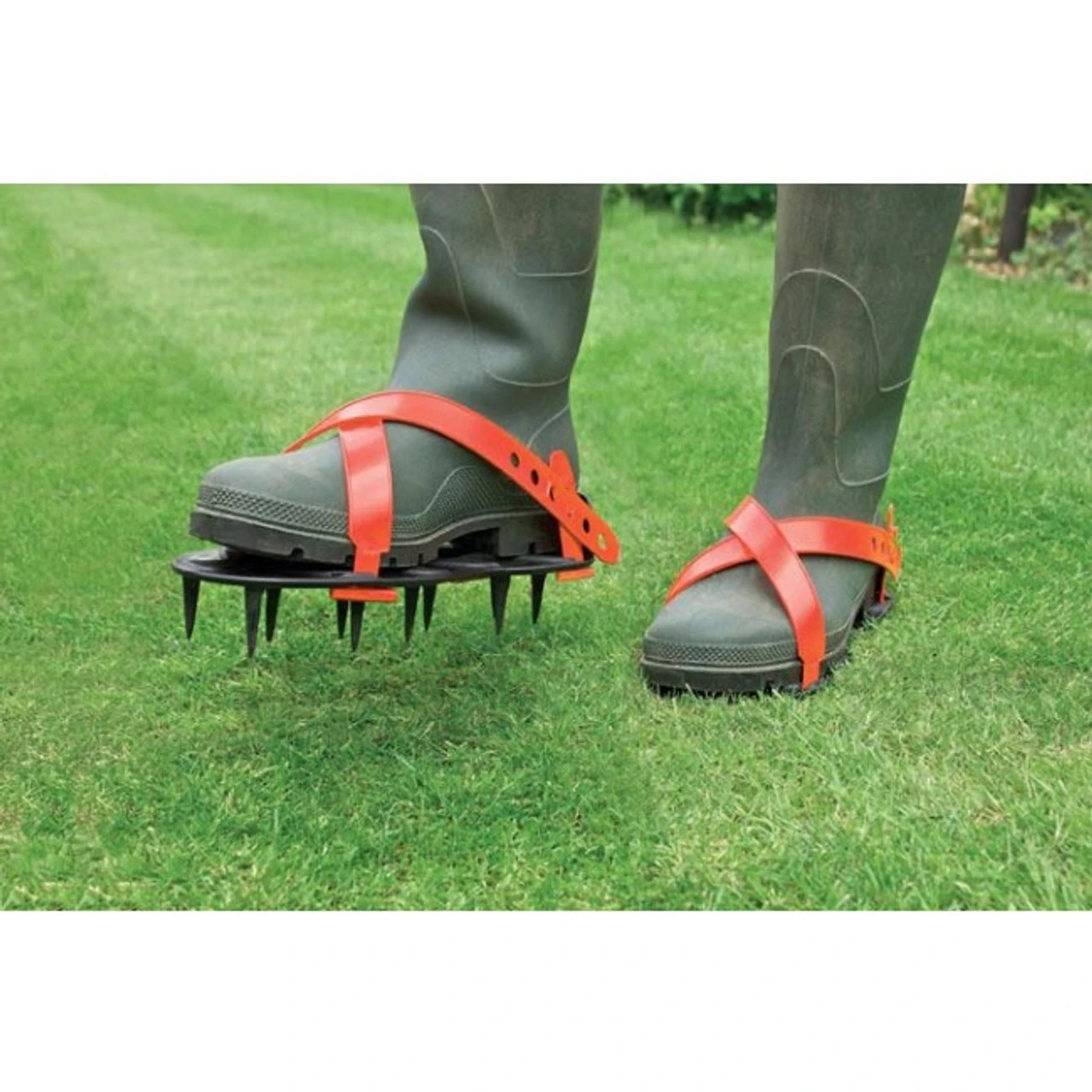 The simple way to aerate your lawns, Simply strap on to your feet wearing either your wellington boots or shoes. Walk slowly up and down your lawn making sure the spikes go right into the lawn for maximum aeration.
